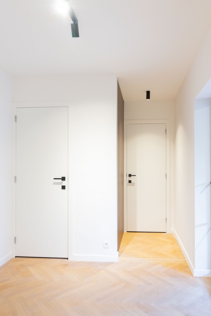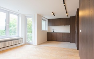 Bij het betreden van het appartement op de 4de verdieping wordt u verwelkomd in de inkomhal met sierboog en maatkasten. Via de gietijzeren deur komen we in de leefruimte met authentieke visgraat parket, maatkasten en een volledig geïnstalleerde, op maat gemaakte keuken. Grenzend aan de leefruimte is er een balkon.